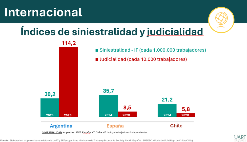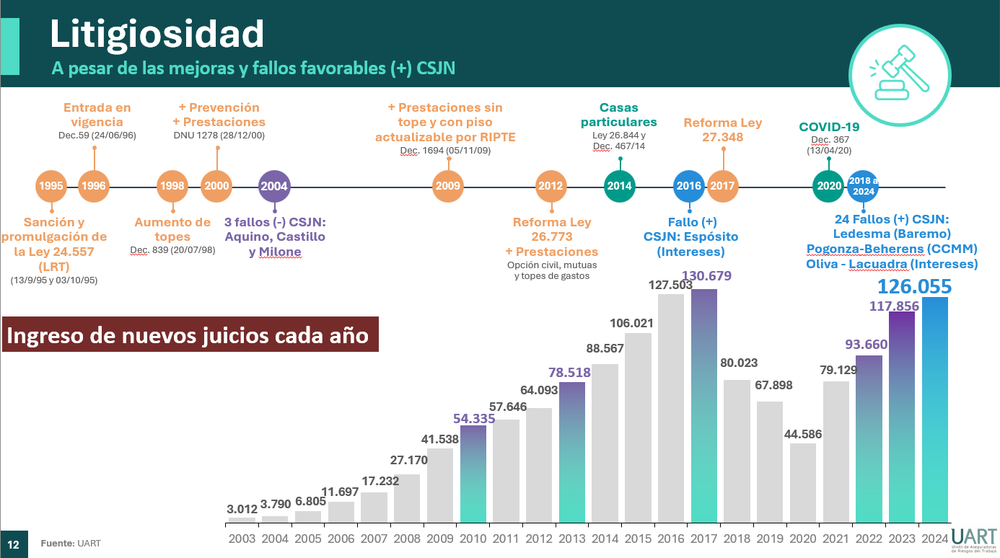 Lo paradójico es que, como contraparte, la cantidad de juicios nuevos se ha ido elevando y pasó de 3.012 en 2003 a 126.055 en 2024. Y que, mientras el índice de siniestralidad es de 30,2 cada millón de trabajadores, el de judicialidad es de 114,2 cada 10 mil trabajadores. Esto, cuando en Chile el de siniestralidad es del 21,2 y el de judicialidad del 5,8.